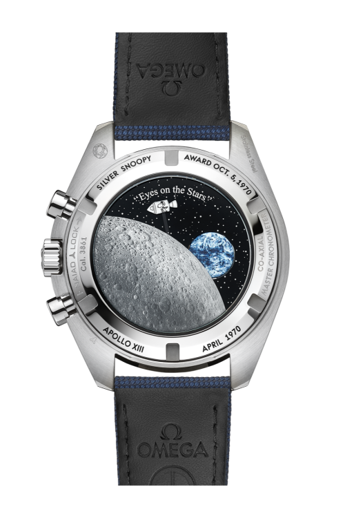 这款手表采用精钢表壳搭配银质表盘,9点位小表盘饰有“史努比”银质浮雕勋章。手表的背面设计最让人心动,有两处动态设计,地球与9点位的秒针同步,一直保持旋转。而当计时秒针启动时,史努比驾驶着宇宙飞船,如同阿波罗13号的宇航员们,从月球背面驶出,展开一场惊心动魄、又让人铭记至今的回家之旅。