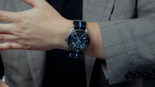 为了应对6000米的超强水压,钛金属版本的表耳造型比较独特,它跟表壳一体成型,在当中做了断开处理,搭配欧米茄NATO表带,舒适轻便。